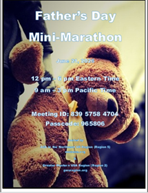Father’s Day Mini-Marathon Flyer: 2026 Fathers Day Marathon June 21, 2026 12 pm – 6 pm Eastern Time 9 am – 3 pm Pacific Time Meeting ID: 839 5758 4704