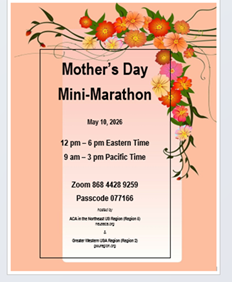 Mother’s Day Mini-Marathon Flyer: 2026 Mothers Day Marathon May 10, 2026 12 pm – 6 pm Eastern Time 9 am – 3 pm Pacific Time Zoom 868 4428 9259 Passcode